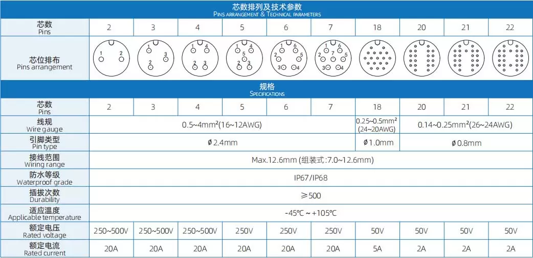 Пластиковый водонепроницаемый разъем/серия E16 Тип: Прямая вилка в сборе Пол: Гнездо Соединение: Байонетное (B) Соединение: Под пайку Количество жил: 2,3,4,5,6 7,18,20,21,22 контакта Экранированное: Нет сертификации : CE RoHS