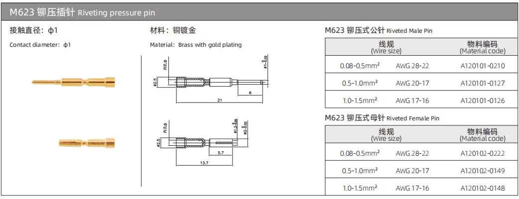 | M623 Заклепочный штифт 1 мм | А120101-0127 | 0,5-1,0 мм² AWG: 20-17 | ||