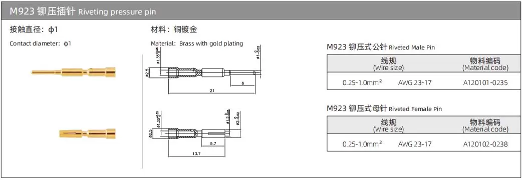 | M923 Заклепочный штифт 1 мм | А120101-0235 | 0,25-1,0 мм² AWG: 23-17 | ||