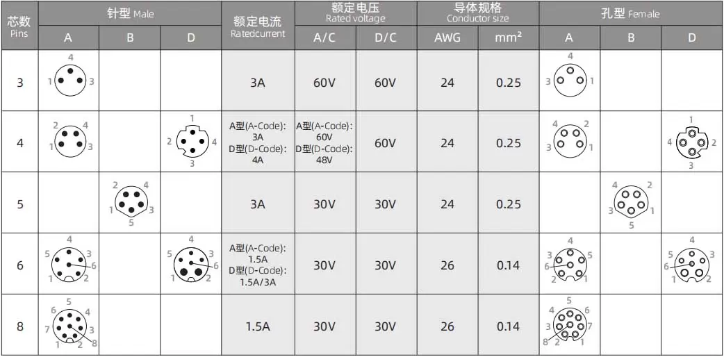 Разъемы европейского стандарта серии M8, Тип конструкции: Розетка для переднего монтажа, Способ подключения: Печатная плата, Тип контакта: Штекер, Номер контактов: 3,4,5,6,8-контактный, Экран: Нет, Сертификация: CE, RoHS, UL, Стандарт :МЭК 61076-2-104,