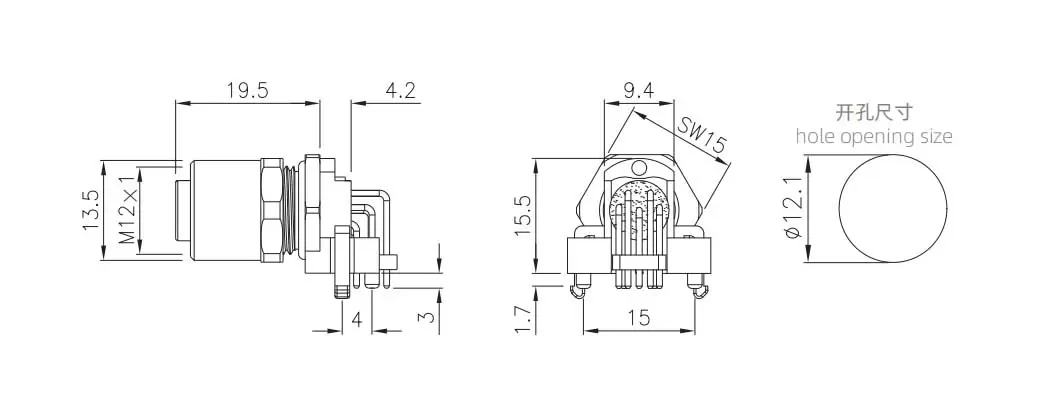 | М12 изогнутая игольчатая гнезда (PCB, винт M12*1) | M12-P3A- GPLM12 | M12-P3A- GPLM12 -JD | 3A | ||