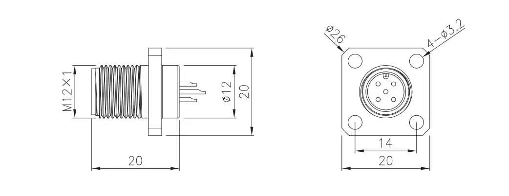| M12 квадратный фланец мужской гнездо (припой, винт14*14) | M12-P5D-GWH | 5d | ||