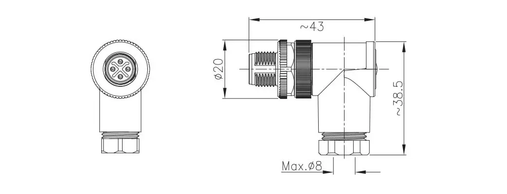 | M12 угловой пластиковой пластиковой заглушки (тип питания, винт) | M12-P5L- PLDP9 | (4+PE) L. | ||
