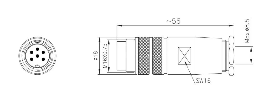 | Прямой штекер M16, металлический , собранный (под пайку) | М16-П7А-ГВАП9 | 7-контактный А-код | ||