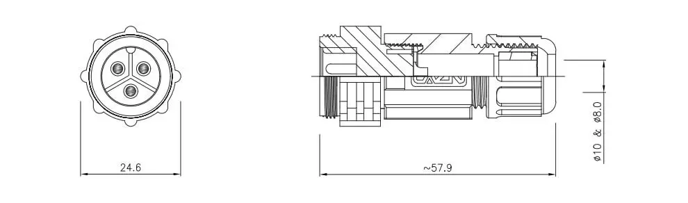 | E13 Прямой штекерный разъем (резьбовой) | 300В | 20А | E13T-P3B- PWK08 | 3Б | ||