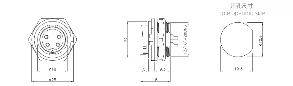 | Гнездо E13 с передним креплением ( байонетное ) | 30В | 2А | E13B-S18-PWB | 18 | ||