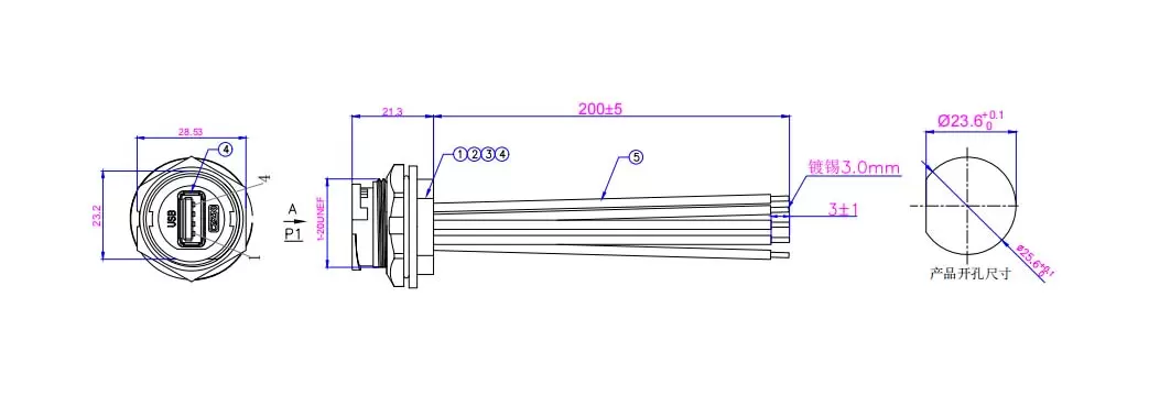 | E16 USB-гнездо с задним креплением и проводом (байонет) | USB3.0 | E16B-FU3-PWF-0.2PV |